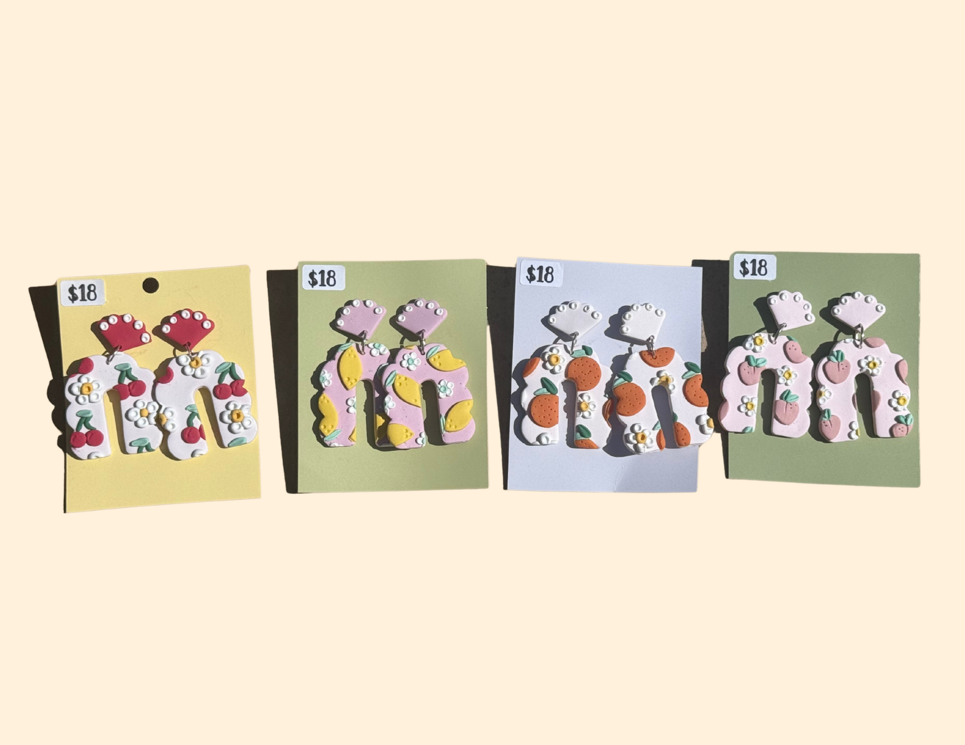 Add a splash of juicy color to your day with these handmade Polymer Clay Fruit Arch Earrings! Featuring a delightful mix of tiny fruit: cherries, oranges, peaches, and lemons.